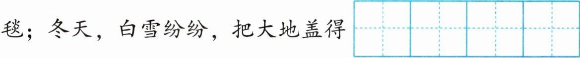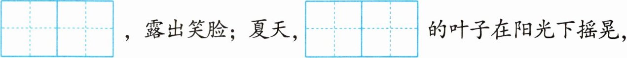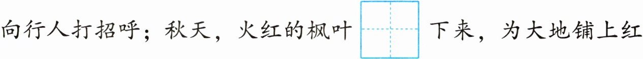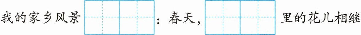 我的家乡风景$\begin{array}{|c|c|}\hline yōu & měi \\\hline\end{array}\\\hline $:春天,$\begin{array}{|c|c|}\hline huā & tán \\\hline\end{array}\\\hline 里的花儿相继\begin{array}{|c|c|}\hline kāi & fàng \\\hline\end{array}\\\hline $,露出笑脸;夏天,$\begin{array}{|c|c|}\hline cuì & lǜ \\\hline\end{array}\\\hline $的叶子在阳光下摇晃,向行人打招呼;秋天,火红的枫叶$\begin{array}{|c|}\hline luò \\\hline\end{array}\\\hline $下来,为大地铺上红毯;冬天,白雪纷纷,把大地盖得$\begin{array}{|c|c|c|c|c|}\hline yán & yán & shí & shí \\\hline\end{array}\\\hline $。