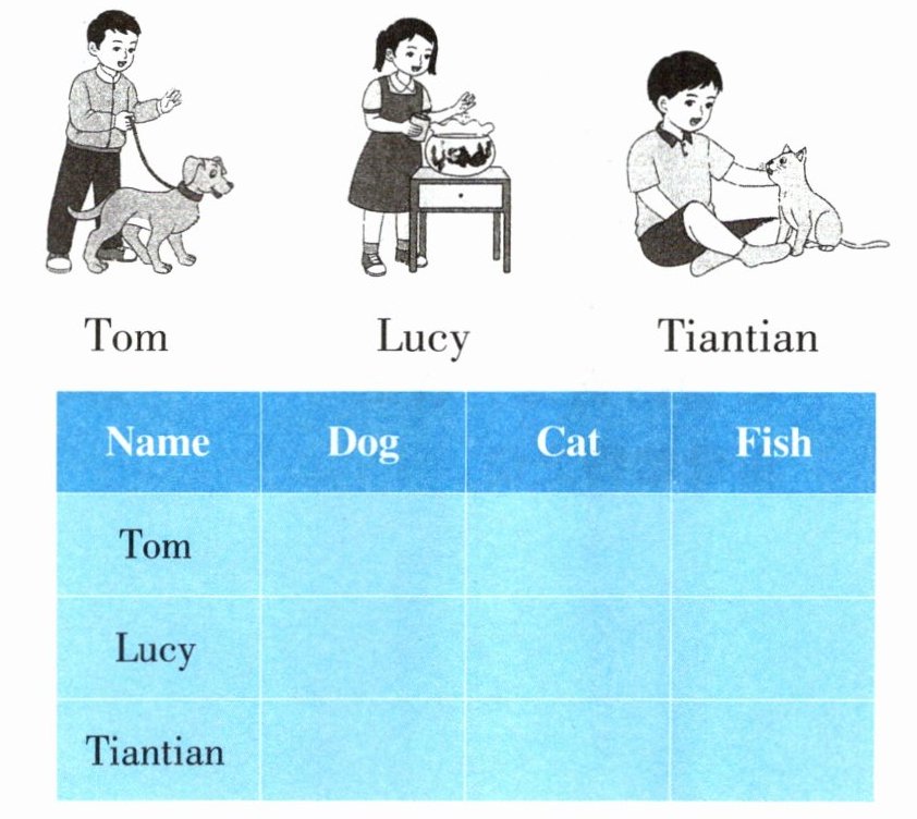 Tom: Dog√ Lucy: Fish√ Tiantian: Cat√