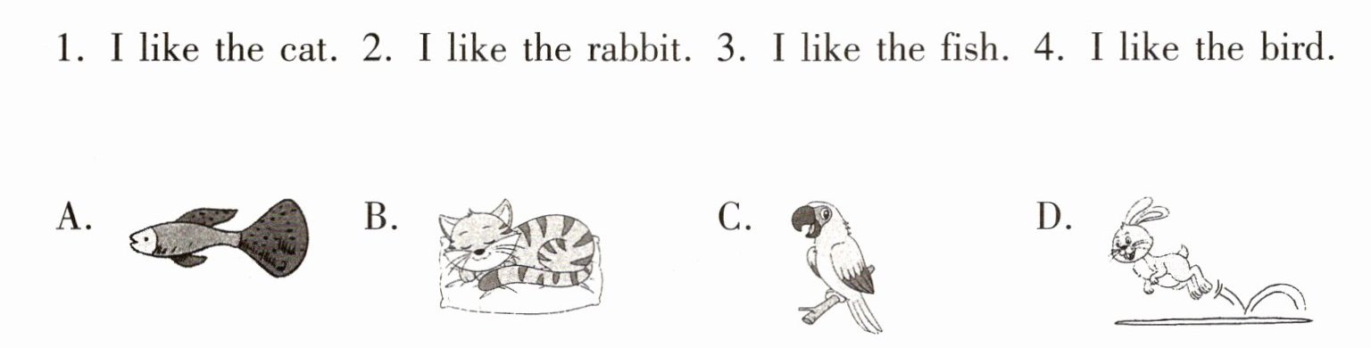 1. I like the cat. 2. I like the rabbit. 3. I like the fish. 4. I like the bird.