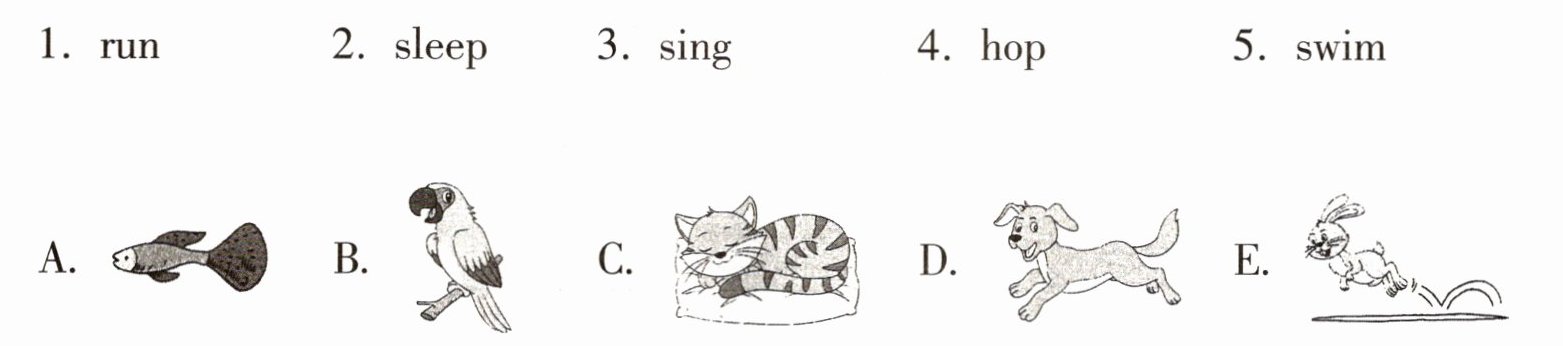 1. run 2. sleep 3. sing 4. hop 5. swim