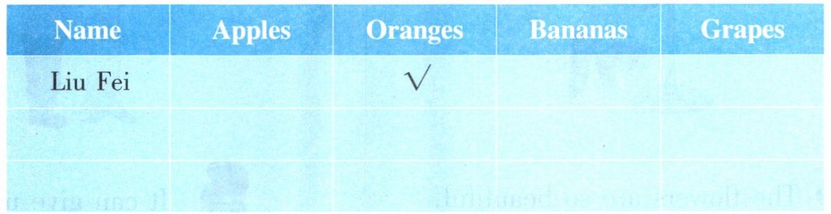 二、调查班里的同学最喜欢吃什么水果,并仿照示例填一填,说一说。