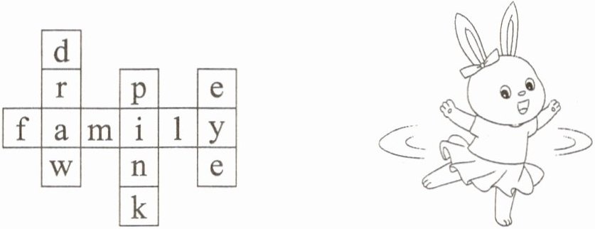 一、小兔子爱变装。今天它是什么颜色的呢?从字谜中圈出表示颜色的单词,并给小兔子涂上相应的颜色!