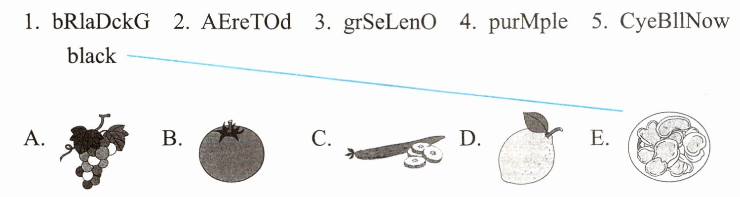 一、用每组字母中的小写字母组成一个颜色单词,并将该单词与相应颜色的水果或蔬菜用线连起来。