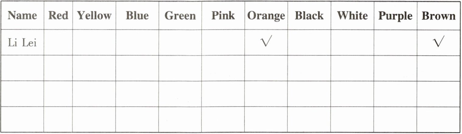 二、调查班里同学们喜欢的颜色,并仿照例子填一填,说一说。