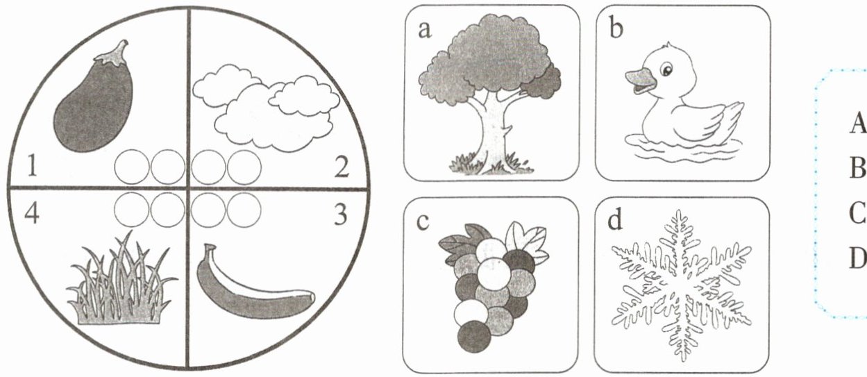 一、给下面左图中的物品选择相应的颜色,然后从右侧图片中找出通常与其颜色相同的事物。(将字母序号填入圈中)