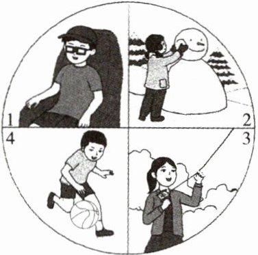 1. see a film 2. make a snowman 3. fly a kite 4. play basketball