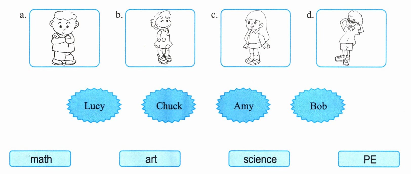 a-Bob-PE; b-Amy-art; c-Lucy-science; d-Chuck-math