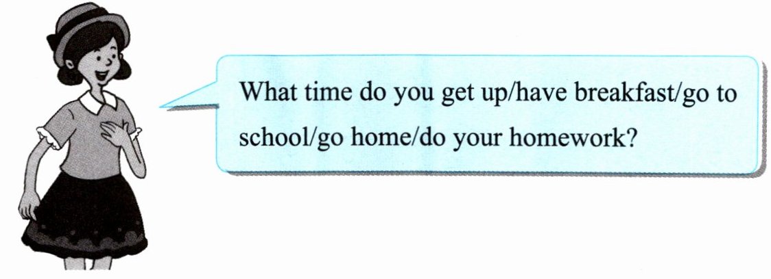 What time do you get up/have breakfast/go to school/go home/do your homework?