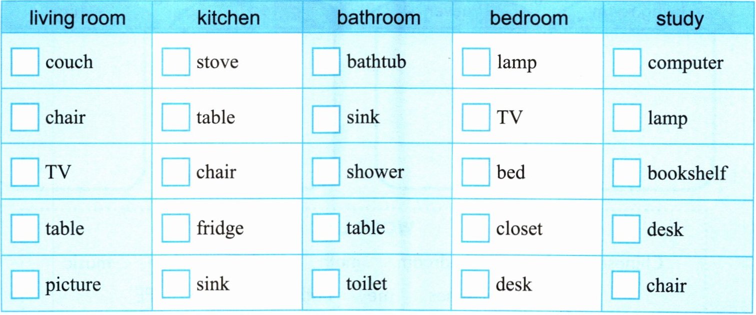 | □ chair | □ table | □ sink | □ TV | □ lamp |