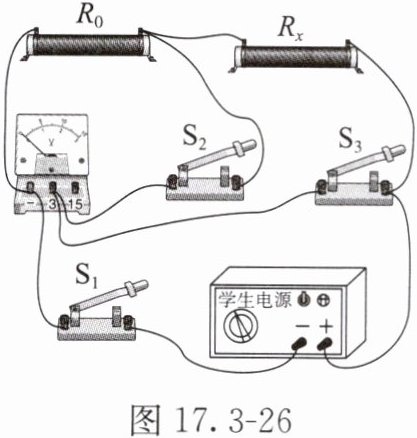 (4)该同学进行了实验创新,利用定值电阻(电阻为$R_0$)和电压表等器材,测量未知电阻$R_x$。他设计了如图17.3-26所示的电路,经检查无误后进行实验。请将下列实验过程补充完整。