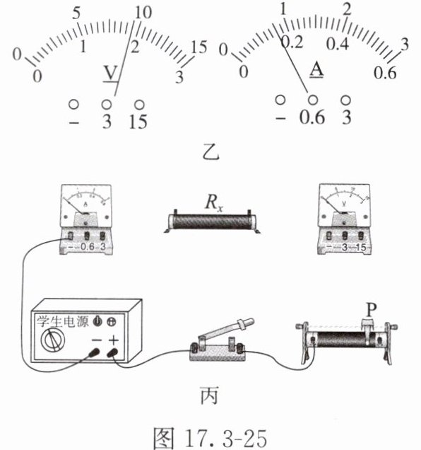 6. (2024·山东泰安)某同学利用有关器材测量未知电阻$R_x$。可选用的器材有电源(电压恒为6V)、三个滑动变阻器[规格分别为a(5Ω 2A)、b(30Ω 2A)和c(50Ω 1A)]、电流表(有0~0.6A和0~3A两个测量范围)、电压表(有0~3V和0~15V两个测量范围)、开关、导线等。该同学根据图17.3-25甲所示电路图进行了正确的实验操作,当滑动变阻器的滑片P处于中间位置附近时,两个电表的示数如图17.3-25乙所示。请你根据以上信息回答问题。