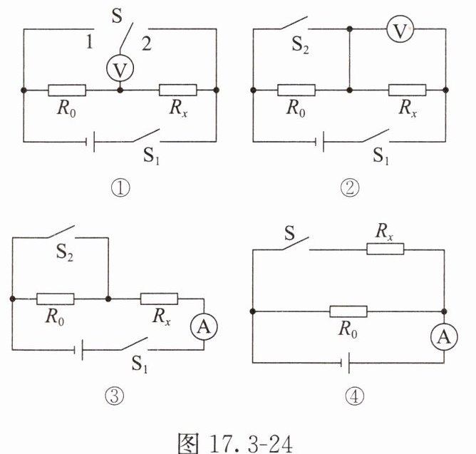 5. 图17.3-24是小科利用实验室常用仪器设计测量未知电阻$R_x$的四种电路。假设电源电压恒定且未知,定值电阻的电阻是$R_0$,实验中只能闭合或断开开关,能够测量出未知电阻$R_x$的电路是(