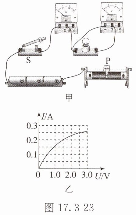 。(4)排除故障后,闭合开关,移动滑动变阻器的滑片,记录多组数据,并绘制出如图17.3-23乙所示的I - U关系图像。当电压表的示数为