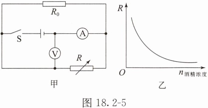 2. 图 18.2 - 5 甲是某酒精测试仪的简化电路图,定值电阻的电阻为 $ R_{0} $,酒精气体传感器的电阻为 $ R $,其电阻 $ R $ 随 $ n_{酒精浓度} $ 变化的图像如图 18.2 - 5 乙所示。若电源电压不变,闭合开关,当酒精气体传感器周围酒精浓度增加时,下列判断正确的是(