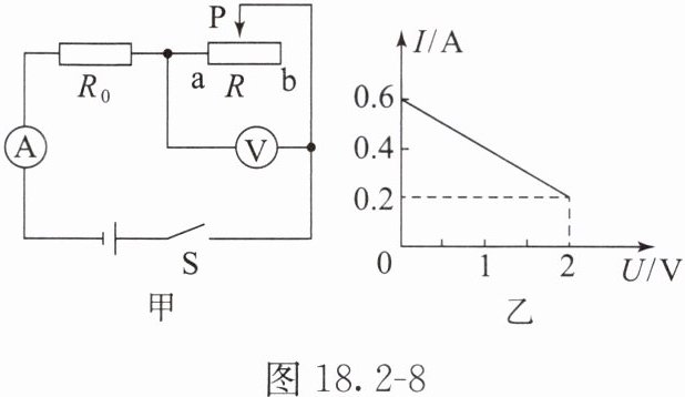 8. 如图 18.2 - 8 甲所示,电源电压恒定,定值电阻的电阻为 $ R_{0} $。闭合开关,在将滑动变阻器的滑片 $ P $ 从 $ a $ 端移到 $ b $ 端的过程中,其电流 $ I $ 与电压 $ U $ 的关系图像如图 18.2 - 8 乙所示,则电源电压为
