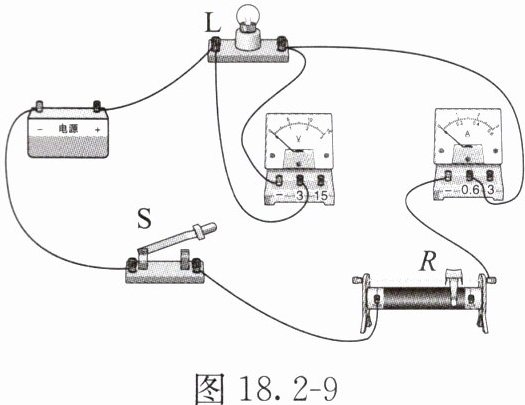 9. 某学习小组为了研究小灯泡的亮度与功率大小的关系,连接了如图 18.2 - 9 所示的实物电路,电源两端电压保持不变,滑动变阻器接入电路的最大电阻为 $ 40 \Omega $。滑动变阻器的滑片置于最右端,开关 $ S $ 闭合,电压表的示数为 $ 1.2 V $,电流表的示数为 $ 0.12 A $,小灯泡发光很暗。