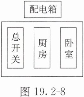 7. 如图 19.2 - 8 所示是小明家中的配电箱简化后的示意图(将家中房间简化为厨房和卧室),当家中总电流过大时总开关(空气开关)断开。厨房和卧室的开关分别控制厨房和卧室中的用电器。