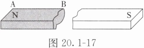 8. 小明不小心将条形磁体从中间摔成了两半,他拿起标注为 N 极的一半磁体,这段磁体两端为 A、B,如图 20.1 - 17 所示,他认为这段磁体只有一个磁极 N 极。请你自选器材,证明他的观点是错误的。
