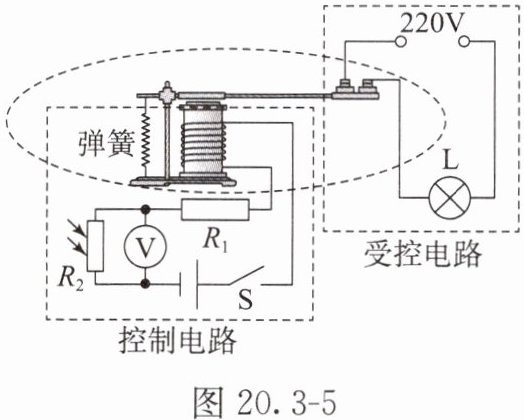 【典例2】感应照明灯可以在天暗时自动发光,天亮时自动熄灭;控制电路如图20.3 - 5所示,电源电压恒定,$R_1$为定值电阻的电阻,光敏电阻的电阻$R_2$随光照强度而变化。