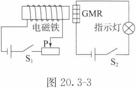 【典例1】为探究巨磁电阻(GMR)的特性,实践小组设计了如图20.3 - 3所示电路。两电路中电源电压都保持不变,实验发现,当闭合开关S₁、S₂后,在滑片P向左移动的过程中,指示灯明显变亮。下列说法错误的是(
