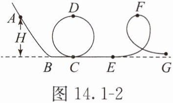 4. 如图14.1-2所示是小明设计制作的过山车模型,点A、D、F的高度相同,小明说:“现让小球从A点由静止开始运动,小球将顺利经过D、F点滑到终点”。请判断,小明的说法______(选填“正确”或“不正确”),并说明理由:________________________。
