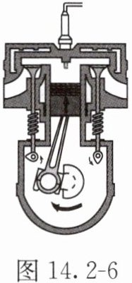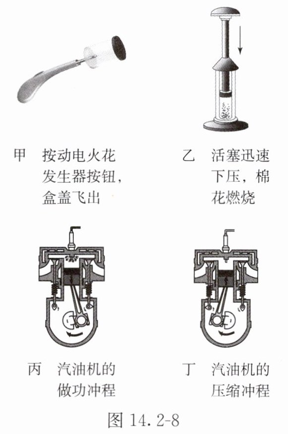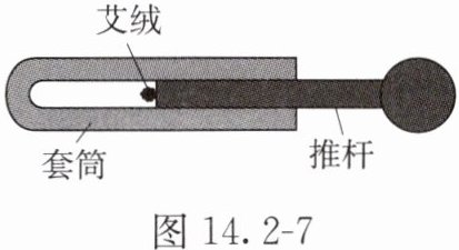 6. 一种点火器的结构如图14.2-7所示,它以牛角为套筒,木质推杆前端黏附艾绒。取火时一只手握住套筒,另一只手向内猛推推杆,推杆前端的艾绒就会被点燃,拔出推杆后,吹吹艾绒就有火苗产生。手推推杆入筒的过程与内燃机工作冲程相同的是(