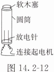 10. 在如图14.2-12所示的“汽油机模型”实验中,将少量的汽油喷入筒内,用软木塞塞住筒口,摇动起电机,观察到放电针放电,汽油燃烧,软木塞被高温高压的气体冲出。下列说法正确的是(