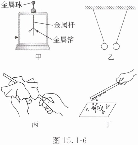 6. 四个轻质小球相互靠近时的现象如图15.1 - 7所示。如果甲带正电,那么乙