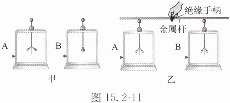 3. 如图15.2 - 11甲所示,取两个相同的不带电的验电器A和B,用与丝绸摩擦过的玻璃棒接触验电器A的金属球,使A带电。然后用带有绝缘手柄的金属杆把A和B连接起来,A的金属箔张开的角度减小,B的金属箔张开,如图15.2 - 11乙所示。则( )