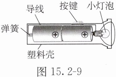 5. 图15.2 - 9是常用手电筒的结构图,观察发现:电池相当于电路中的_______,按键相当于电路中的_______,用电器是图中的_______。
