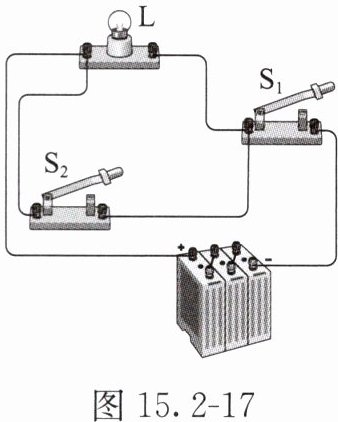 4. 如图15.2 - 17所示,当S₁闭合、S₂_______时,小灯泡发光;当开关S₁和S₂都断开时,电路处于_______状态。