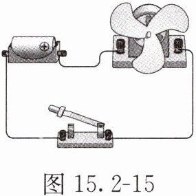 2. 把电池和玩具电风扇连接起来的实物图如图15.2 - 15所示。请在虚线框内画出相应的电路图。玩具电风扇用其核心部件电动机—M—表示。