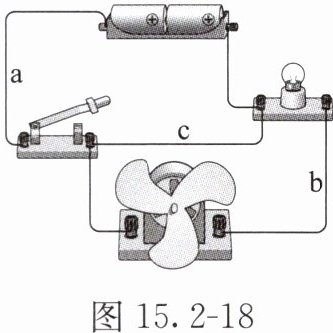 5. 小明将小灯泡接入如图15.2 - 18所示的电路中,闭合开关后,电路处于_______(选填“通路”“短路”或“断路”)状态,可能会导致_______(选填“电源”“小灯泡”或“小风扇”)损坏;要保证电路安全且小灯泡和小风扇能正常工作,需拆除图中的导线_______(填序号)。