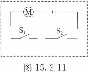 【典例3】某款智能锁支持密码与指纹两种认证方式开门,密码正确相当于开关S₁闭合,指纹正确相当于开关S₂闭合,开门由电动机完成。请你在图15.3-11中完成符合上述要求的智能锁电路。