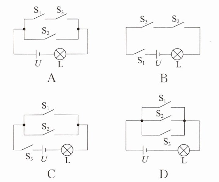 【典例4】小明注意到爸爸在给新能源汽车充电时,先闭合空气开关S₁,将充电桩连接电源,然后将充电枪插入车辆的充电接口(相当于闭合开关S₂),再在亮灯位置的刷卡感应区进行刷卡(相当于闭合开关S₃)即可开始充电,若用小灯泡L发光模拟充电成功,则符合要求的模拟电路是(