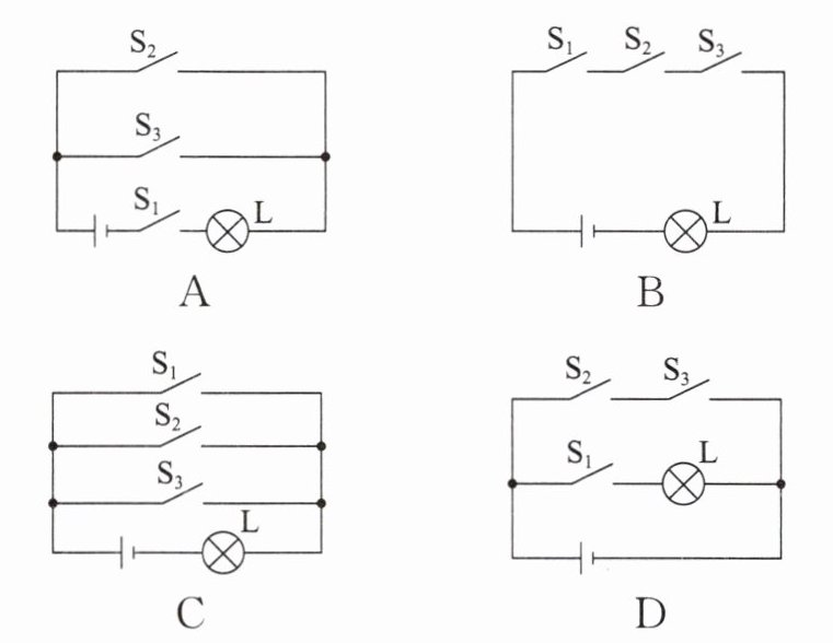 1. 解锁某款手机屏幕的电路可简化为由三个开关控制的电路图,用小灯泡L代表手机屏幕,开关分别是密码解锁开关S₁、指纹解锁开关S₂、人脸解锁开关S₃,三种方式中的任意一种都能解锁手机。下列电路图符合要求的是( )
