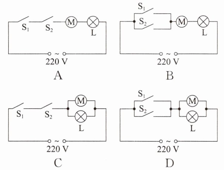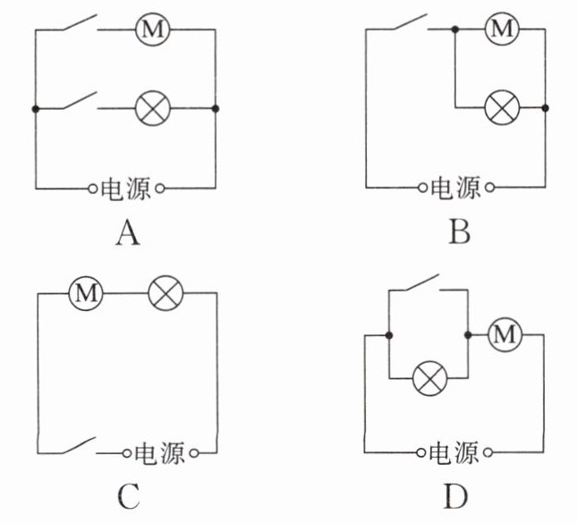3. (2024·四川巴中)为了减少炒菜时对油烟的吸入,厨房里安装了一台抽油烟机。抽油烟机上面的照明灯和电动机既可以同时工作,又可以独立工作。以下关于抽油烟机的内部电路设计,你认为符合要求的是( )