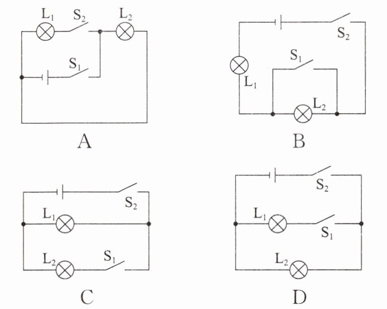 5. 物理课堂上,老师拿出一个黑箱让同学们探究箱内电路的连接情况。箱子外部有两个小灯泡和两个开关,同学们进行了如下操作:只闭合开关S₁,两灯都不亮;只闭合开关S₂,两灯都亮;开关S₁、S₂都闭合,只有小灯泡L₁亮。下列电路与之符合的是( )