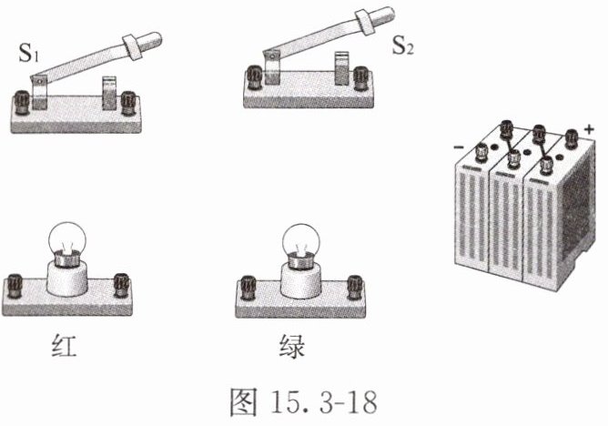 6. 根据要求设计电路。如图15.3-18所示,将设计好的电路图画在虚线框中,并用笔画线表示导线连接相应的实物电路。要求:①只闭合S₁时,红灯发光,绿灯不发光;②S₁、S₂都闭合时,两灯都发光;③只闭合S₂时,两灯均不发光。