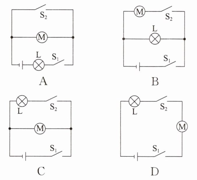 4. (2024·四川南充)不戴头盔存在安全隐患。小明设计以下方案:骑行前,扫码成功后开关S₁闭合,指示灯L亮,但电动机M不工作;从车头取出头盔并戴上后,头盔内遥控设备遥控开关S₂闭合,电动机M才通电工作;若只戴头盔不扫码则无法骑行。符合以上设计要求的电路是( )