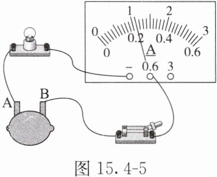 4. 小明用柠檬自制水果电池,将电流表和一个小灯泡接入,电流表指针偏转情况如图15.4-5所示。根据指针的偏转情况,我们可以知道