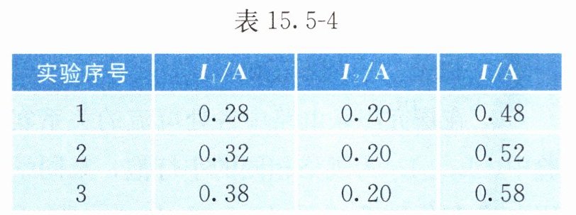 (3)明明按照电路图只更换第 1 支路上的小灯泡进行多次实验,测量通过第 1 支路的电流 $ I_1 $、通过第 2 支路的电流 $ I_2 $ 和干路电流 $ I $,实验数据记录在表 15.5 - 4 中。