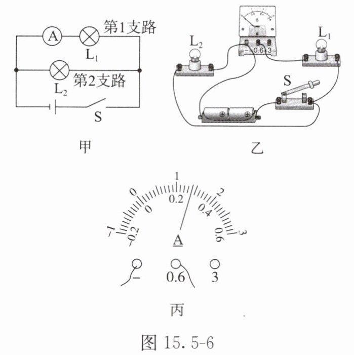 (1)明明按照电路图连接好相应的实物电路(图 15.5 - 6 乙),闭合开关 $ S $,电流表的指针位置如图 15.5 - 6 丙所示,则通过第 1 支路的电流为