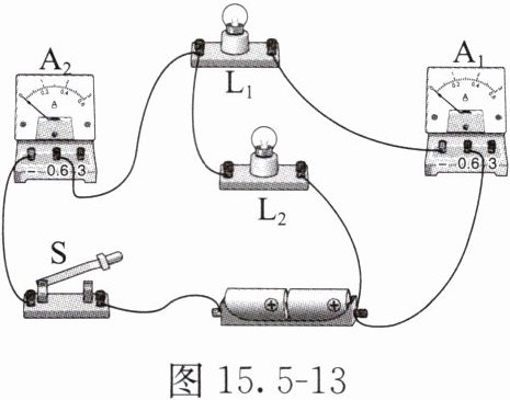 3. 如图 15.5 - 13 所示的实验电路,闭合开关 $ S $ 后,电流表 $ A_2 $ 的示数为 $ 0.5 \, A $,电流表 $ A_1 $ 的示数为 $ 0.3 \, A $。下列说法正确的是(