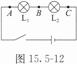2. 在探究串联电路中各处电流的关系实验中,$ L_1 $、$ L_2 $ 为规格相同的小灯泡,某同学用电流表分别测出图 15.5 - 12 中 $ A $、$ B $、$ C $ 三点的电流大小。为了进一步探究电流规律,他下一步的操作应该是(