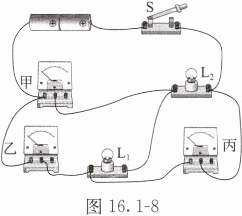 3. 如图16.1-8所示,实物电路由电源,开关S,两个小灯泡L₁、L₂和甲、乙、丙三个电表(电流表或电压表)组成。闭合开关后,两只灯泡均发光。下列关于甲、乙、丙三个电表的判断,正确的是(