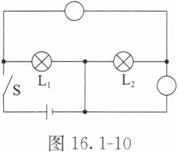 5. 如图16.1-10所示,当开关S闭合后,若要使小灯泡L₁和L₂并联,请在图中圆圈内填入合适的电表。