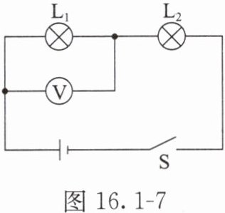 2. 如图16.1-7所示,闭合开关S后小灯泡L₁、L₂都不亮,电压表无示数,用导线分别并联在L₁、L₂和S两端,当导线接在L₂两端时,L₁亮。这个电路的故障可能是(