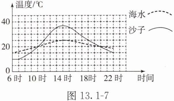 改编)小明在海边玩耍,感觉沙滩上的沙子很热,海水却比较凉爽。某天,他从6时到22时对沙子和海水的温度进行了测量,绘制的温度随时间变化图像如图13.1-7所示。下列分析错误的是(