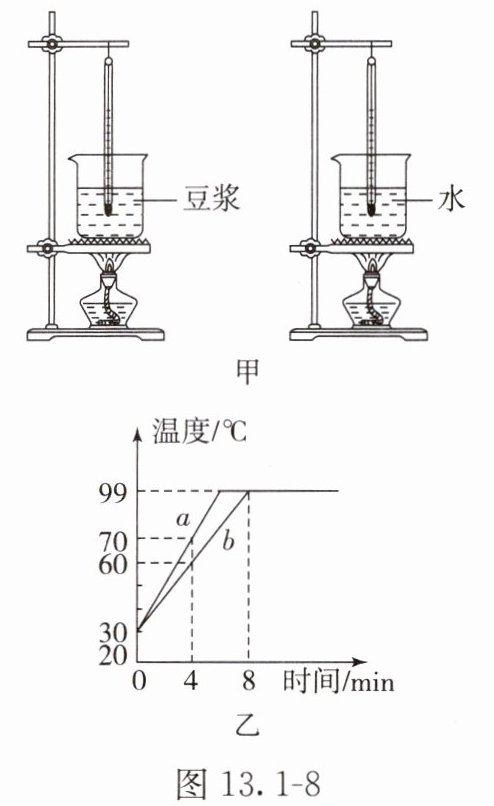 7. (2024·内蒙古通辽)小明在烧水和煮豆浆时发现豆浆比水先沸腾。他猜想原因可能是:A. 豆浆的沸点比水低;B. 豆浆的比热容比水小,于是通过如图13.1-8甲所示的两套相同实验装置进行探究。